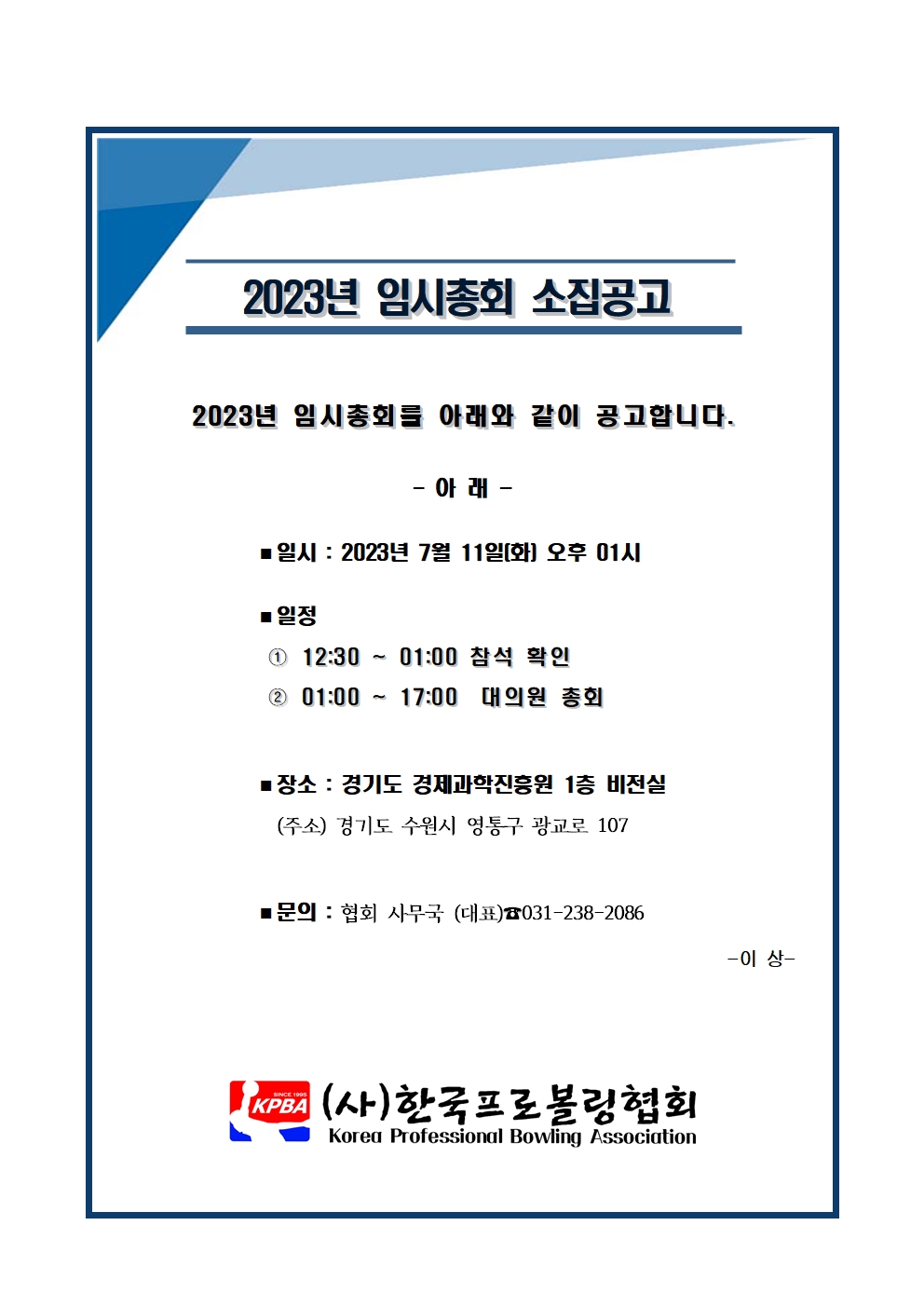 2023년 임시총회 소집공고 페이지 정보 작성자 한국프로볼링 작성일 23-07-06 16:37 조회 4,593회 댓글 0건 본문 2023년 1차 임시총회 소집공고 추천0 이전글[KPBA-2023] 2023 상주 곶감컵 남,여 프로볼링대회 다음글[KPBA-공식 사과문] 2023 청주 로드필드컵 프로볼링대회명 변경 관련 목록 댓글목록 0 댓글목록 등록된 댓글이 없습니다.