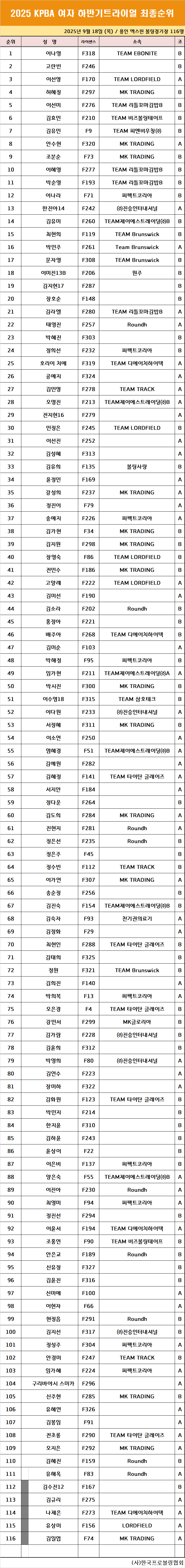 2025 KPBA 여자 하반기 트라이얼 최종순위 페이지 정보 작성자 한국프로볼링 작성일 25-09-18 18:10 조회 4,880회 댓글 0건 본문 2025 KPBA 여자 하반기 트라이얼 최종순위 추천0 이전글2025 KPBA 남자 하반기 트라이얼 최종순위 다음글제2회 리틀꼬마김밥컵 여자프로볼링대회 최종성적 목록 댓글목록 0 댓글목록 등록된 댓글이 없습니다.