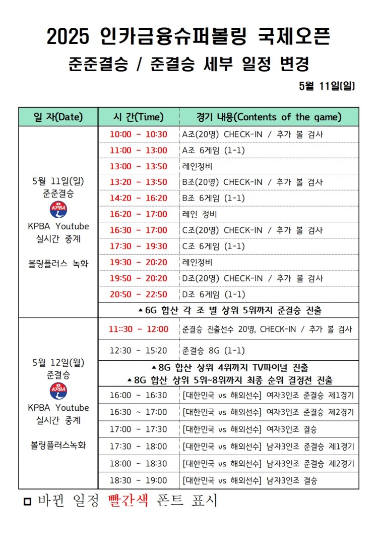 [일정변경 공지] 2025 인카금융슈퍼볼링 국제오픈 준준결승 / 준결승 세부일정 변경 페이지 정보 작성자 한국프로볼링 작성일 25-05-10 08:40 조회 4,178회 댓글 0건 본문 . 추천0 이전글[명단] 2025 인카금융슈퍼볼링 국제오픈 준준결승 진출명단 다음글[조배정] 2025 인카금융슈퍼볼링 국제오픈 본선 조배정 원본 및 레인배정(예선 순위 업데이트) 목록 댓글목록 0 댓글목록 등록된 댓글이 없습니다.